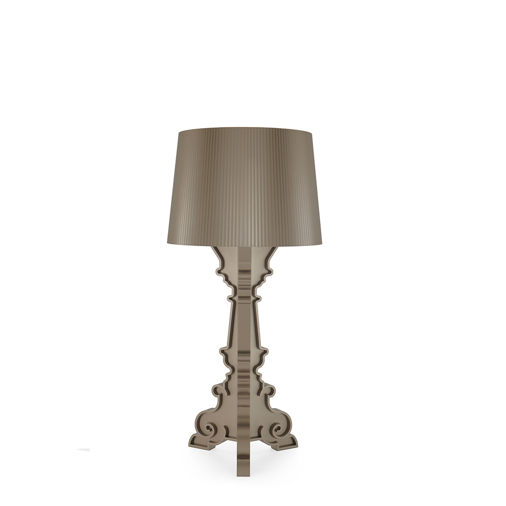 Bourgie s nenapodobitelným stylem je jedním z nejprodávanějších výrobků Kartellu. Kombinuje klasický styl, tradici, bohatost a inovaci. Barokní noha se skládá ze tří zdobených pilířů. Stínidlo je s plisovaným efektem, které nám po zapnutí lampy vytvoří nesčetné odlesky. Stínidlo lampy je jedinečné v upevňovacím systému, který umožňuje tři různé výšky podle druhu použití na 68, 72 nebo 78 centimetrů. Bourgie je nádherná dekorativní stolní lampa, která obohatí každý interiér. Díky své flexibilitě může být použita na stolku v obývacím pokoji nebo vytvořit atmosféru na vašem nočním stolku. Součástí lampy jsou tři žárovky 5W LED, E14.