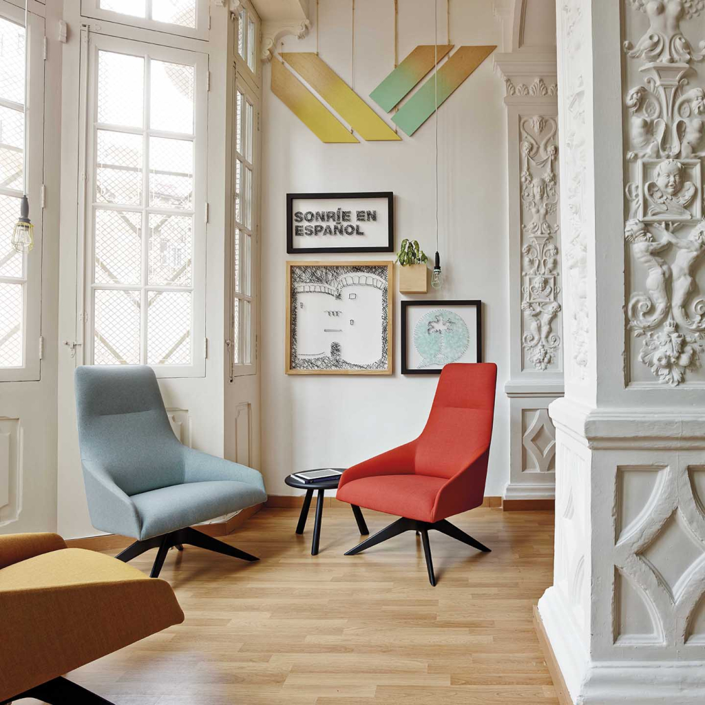 The Alya collection of chairs and armchairs is defined by the comfort of its upholstered seat and its refined, enveloping design. Available with various upholstery options, it can be paired with metal or wooden bases, or in a fully upholstered, floor-length version with a fixed or 360-degree swivel base. Its versatility makes it equally suited to residential interiors, corporate spaces, and multipurpose environments.