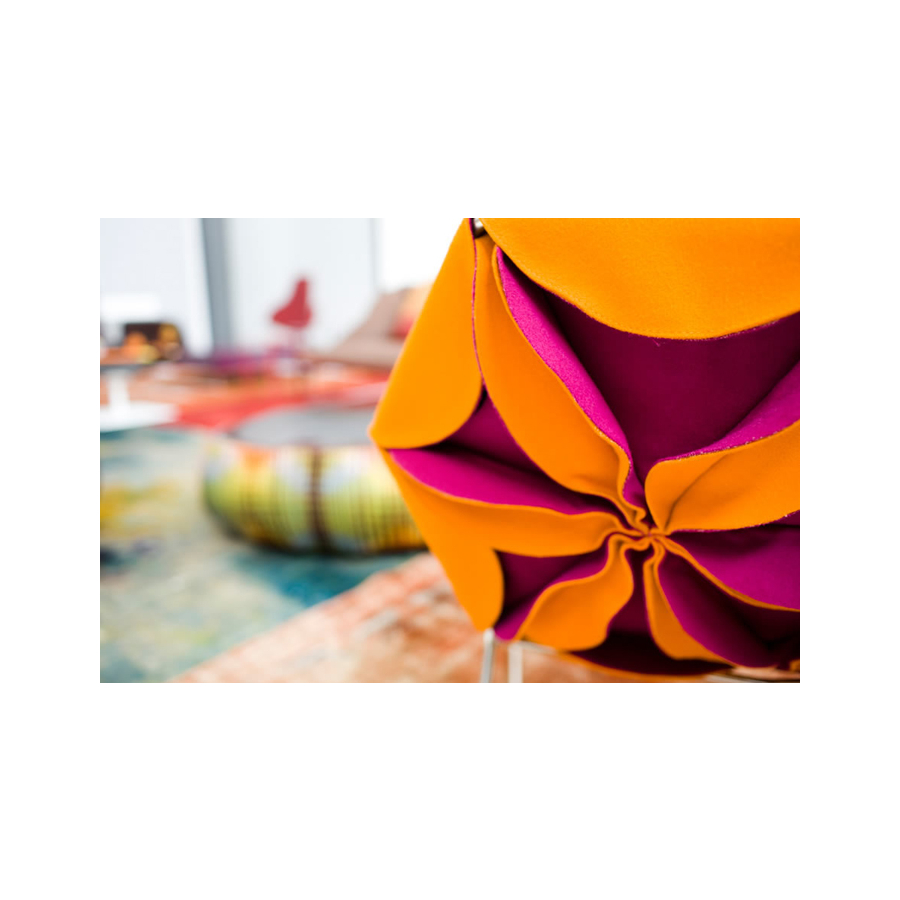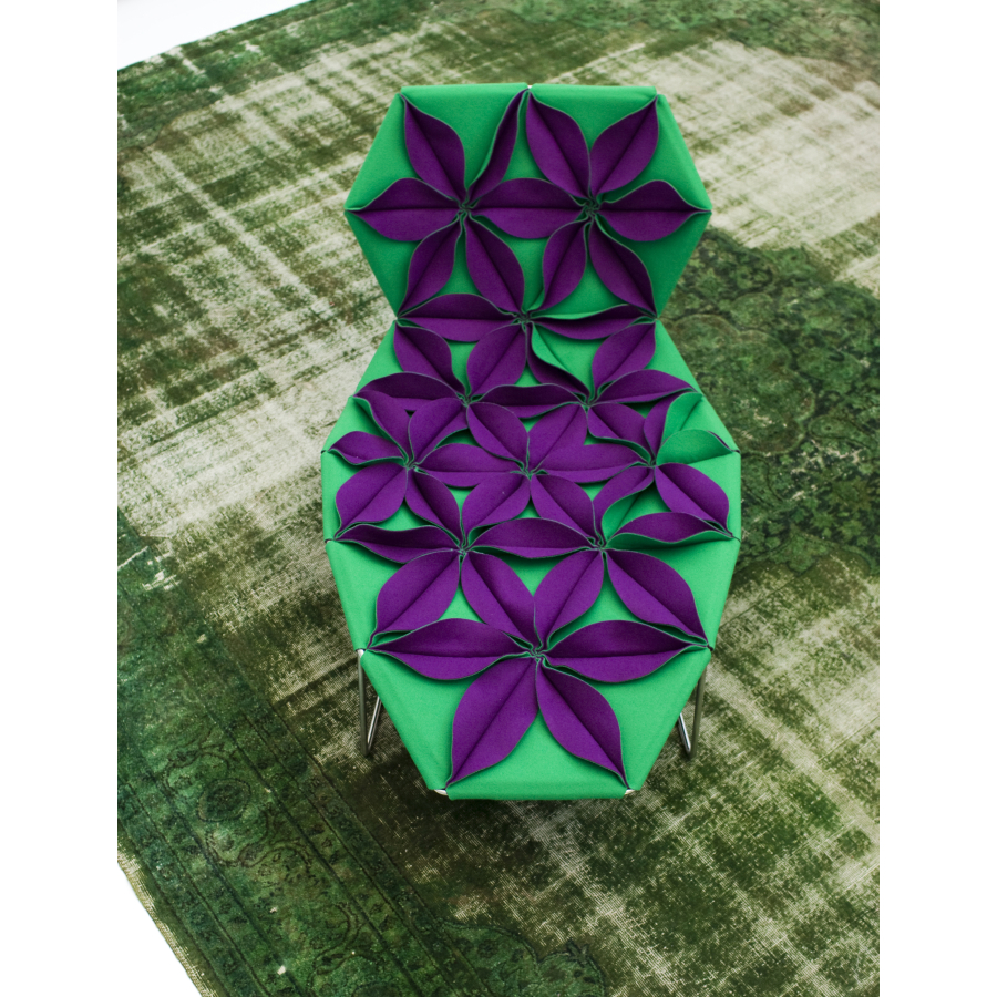 Antibodi reimagines the non-padded chair with a sculptural, three-dimensional form inspired by the cellular geometry of sewn petals arranged in a triangular pattern. The result is a striking floral burst—a symbolic expression of vitality and fertile beauty. Both alluring and paradoxical, Antibodi embodies a dual character: soft and inviting when the petals face upward, or bold and structured with a matelassé effect when reversed.