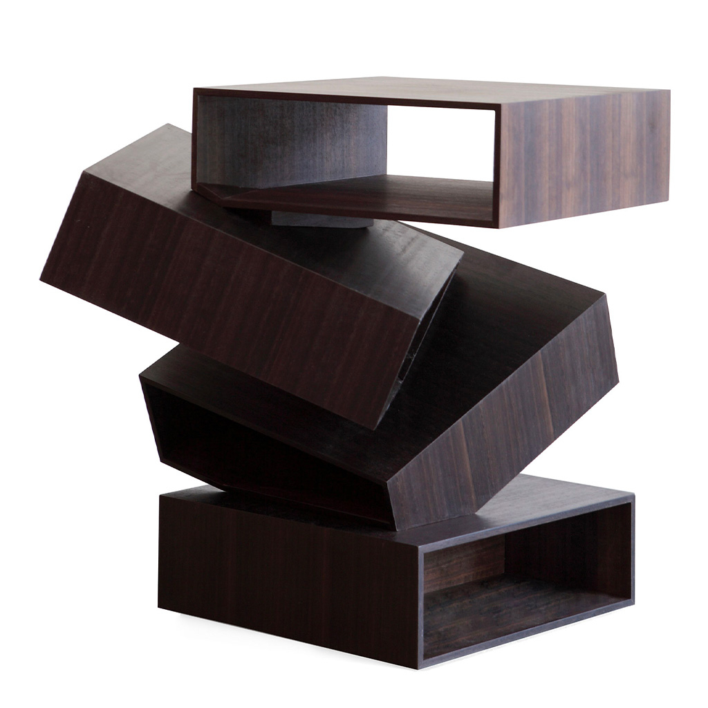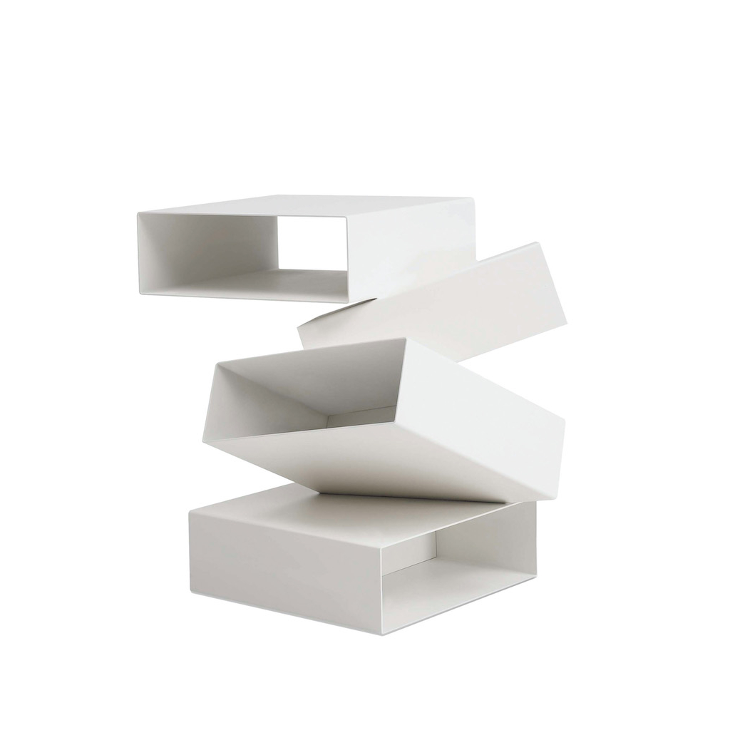 Balancing Boxes is a small table consisting of a series of irregularly overlapping white or black painted metal or in wood (eucalyptus, lauro preto, palissandro santos, ted gum and tineo finishings) boxes, as though balancing in space. Inclinations, interconnections and a multifaceted image, giving different sensations as we look at it from different angles.