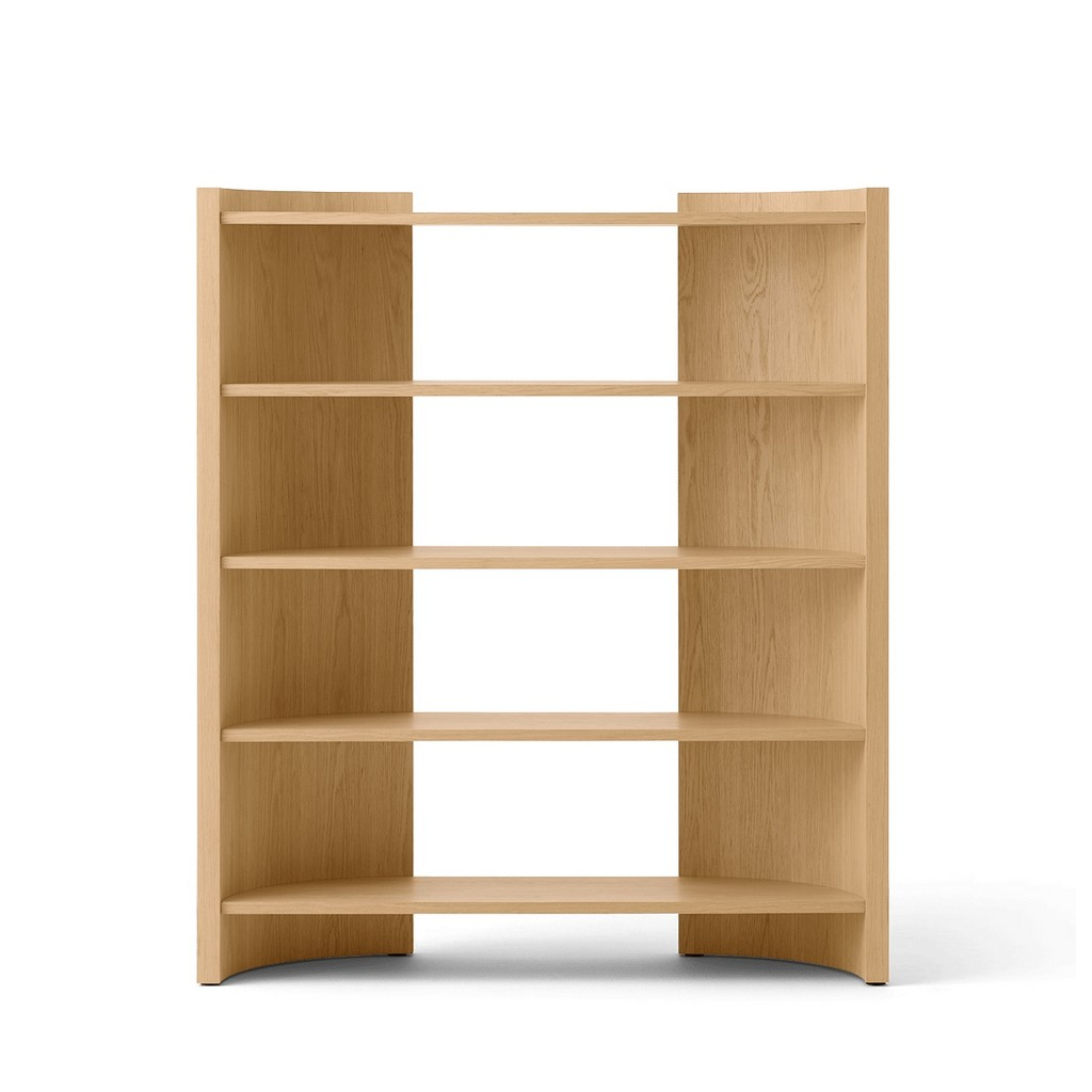 With its distinctive crescent shape and open back, it functions both as shelving and a subtle room divider, maintaining light and visual flow. Crafted from lacquered oak with softened edges, it is available in two heights, offering versatile use from a console piece to a striking standalone feature.