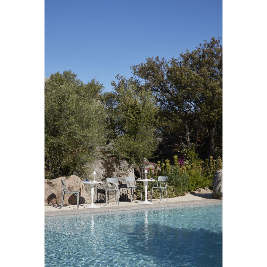 The Dr. NO chair is combined with a round table, Dr. NA, available as a direct complement to the seat. The scratch-proof painted surface and tapered central leg made of plastic and aluminium let Dr. NA live separately with the small armchair to form an ideal dual concept.