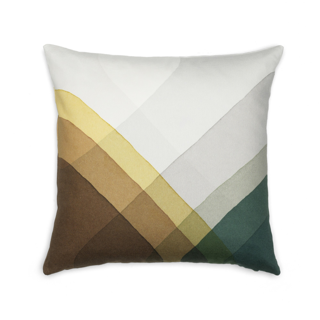 Despite their handcrafted origins, they have a distinctly geometric look. The intersecting and overlapping bands of varying colour intensity were achieved through multiple immersions in different coloured dyes, with the final result serving as an exact template for the printed pattern of the Herringbone Pillows.
