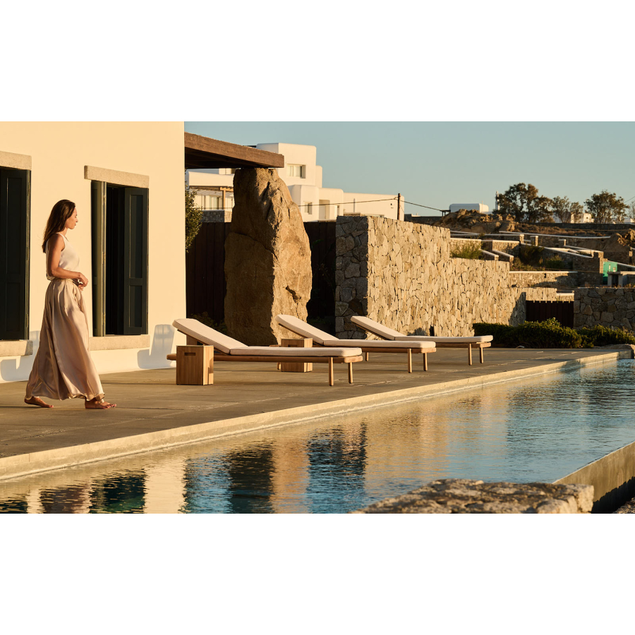 Its base is crafted from a sturdy, hollow teak rectangle with inset handles for easy mobility. What truly sets Tairu apart is its top—made from 400-year-old glazed lava stone sourced from Mount Vesuvius. Each piece is hand-glazed, and high-temperature firing creates a delicate craquelure finish, ensuring that every tabletop is one of a kind. This process also makes the stone highly resistant to heat, water, UV rays, and stains, while keeping maintenance effortless. The tabletop is available in four refined, nature-inspired colors.