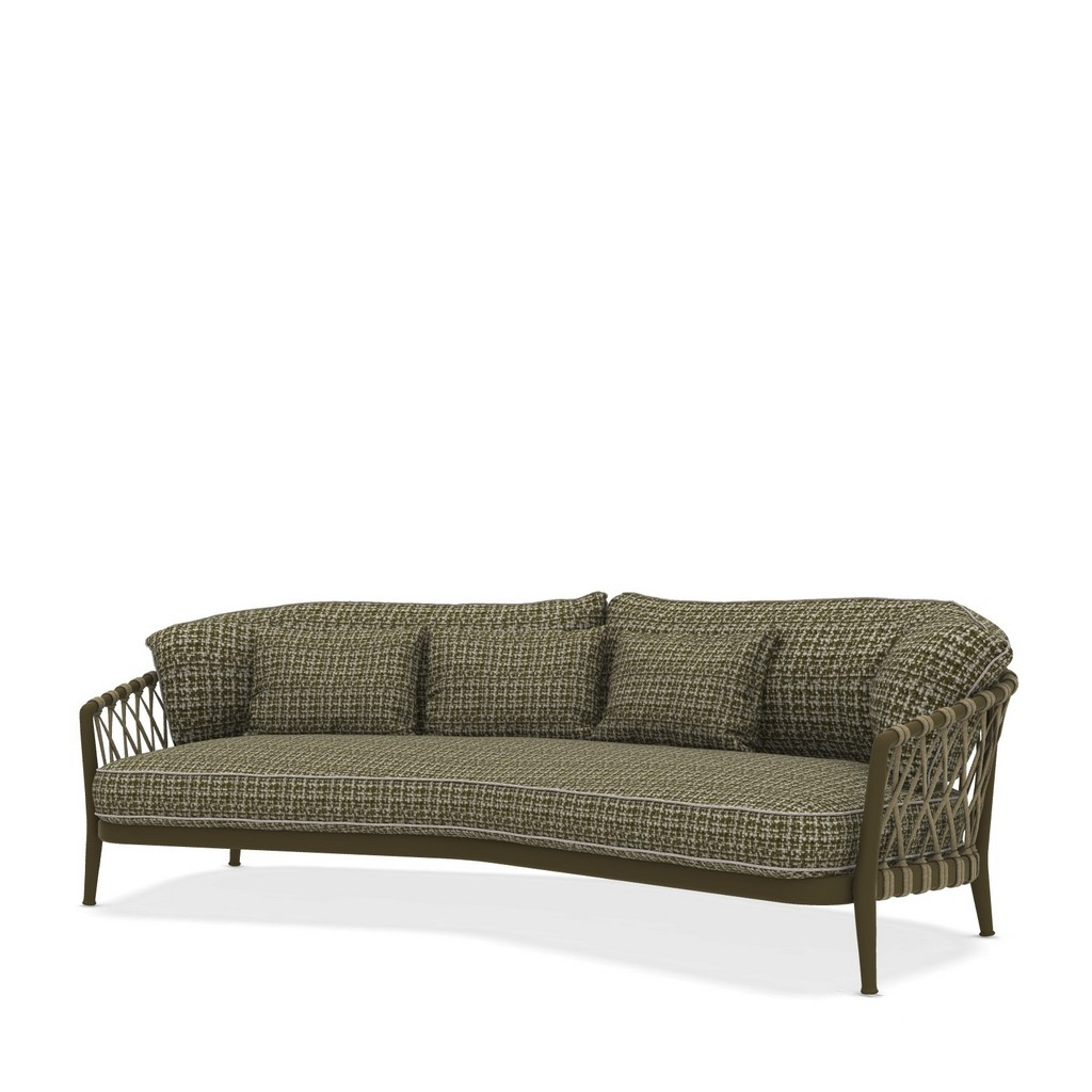 Produkt z expozice: konstrukce lakovaný hliník v barvě olive bronze, výplet polyetylenová vlákna, barva verde fieno - 0424B, sedácí a zádový polštář potah kat. Super, Sirena Verde Melange 2915428, profil cream white colour 0041E, bederní set 3 polštářů, potah látka kat. Super, Sirena Verde 2915400