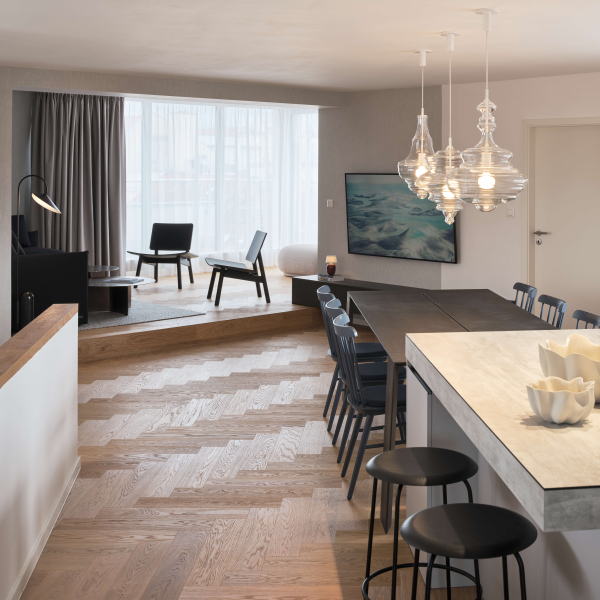 Tereza do návrhu zakomponovala výrazné designové solitéry, například svítidla z kolekce Never Ending Glory Jana Plecháče a Henryho Wielgues od Lasvitu nebo křeslo Hiroi, které ve spolupráci se značkou Cappellini navrhlo české designérské duo, Jánský & Dunděra. Tyto pak doplnila minimalistickými kousky skandinávských značek Ferm Living, Audo nebo Normann Copenhagen. Dominantou prostoru jsou také designové dveře italského výrobce ADL, které jsou navrženy na míru.