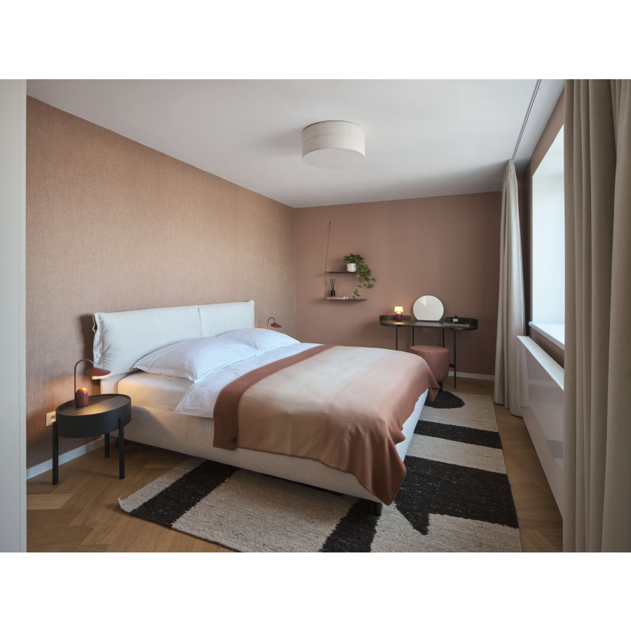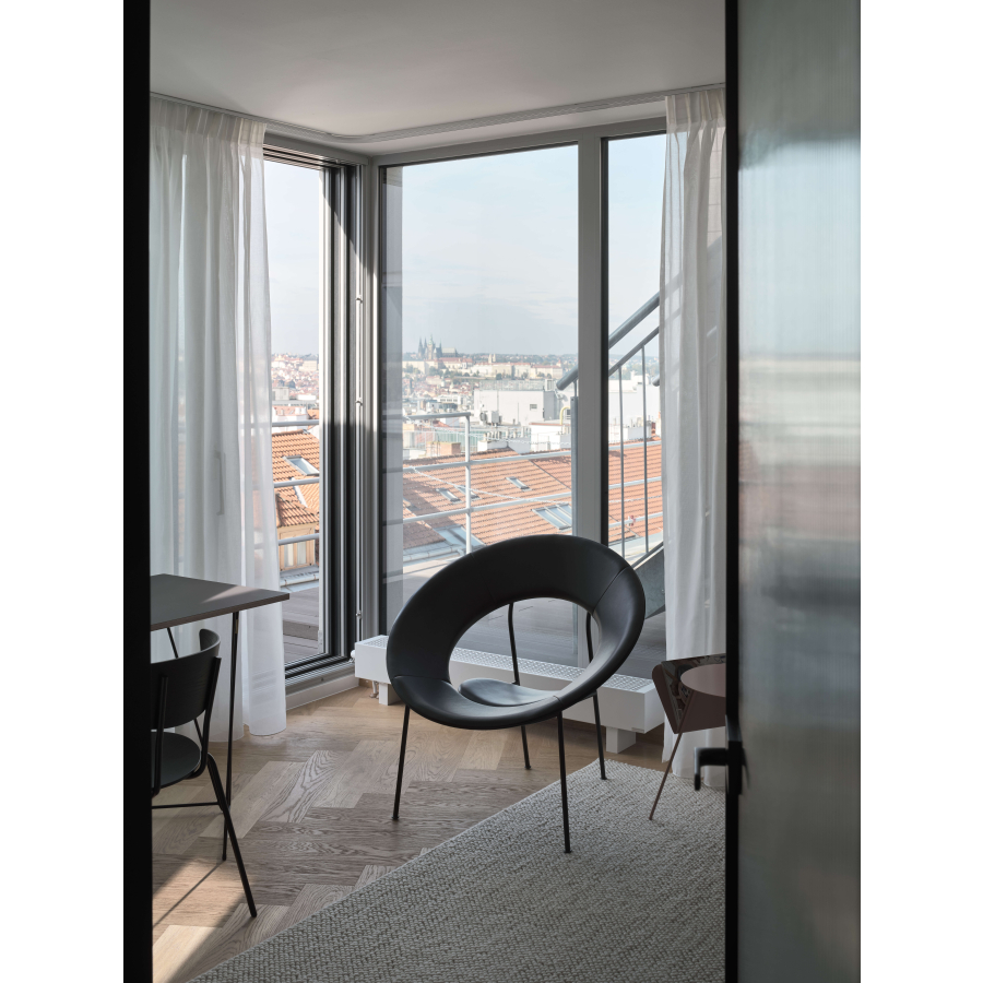 Výrazný rukopis architektky zároveň citlivě pracuje s hlavní předností bytu – terasou a výhledem na kostel sv. Ludmily na Náměstí Míru. Tento prvek proměňuje interiér v působivou scénu, téměř jako z divadla, kde se snoubí design, umění i historické panaroma města a vytváří tak příjemné útočiště.