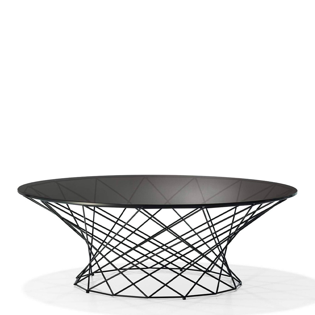 Elegantní a zářivý jako šperk: jemné kovové předivo nese kulatou skleněnou desku, která jemně odráží světlo a hraje si s ním.