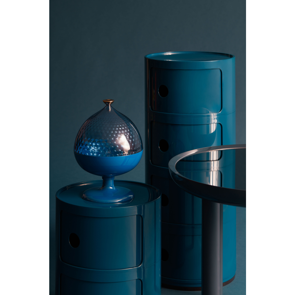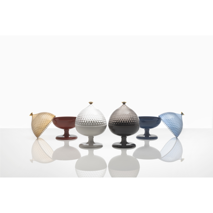 Pumo je dóza inspirovaná architekturou typických domů Alberobello v Apulii. Designér Fabio Novembre pokračuje v tvůrčí cestě ovlivněné architekturou jeho vlasti, kterou se inspiroval u dózy Trullo nebo podnosu Piazza. Dóza je praktická ať už na ovoce, bonbóny nebo jen jako dekorace.